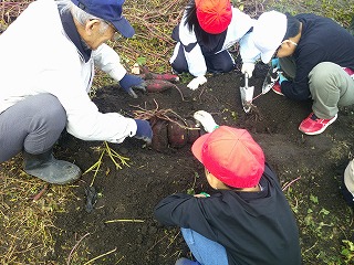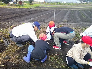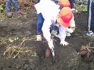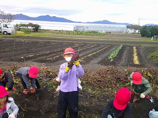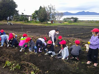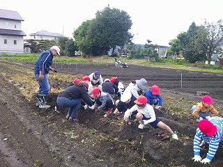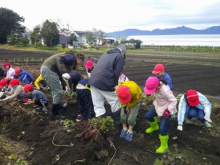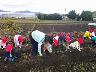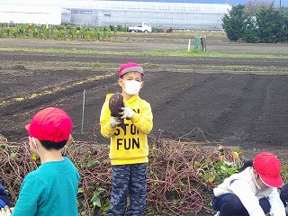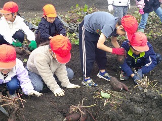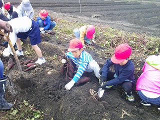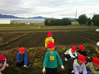 地域の方たちにお世話になり、今まで育ててきたサツマイモを掘りました。いつも、地域の方たちが畑を耕していただき、草も抜いていただき…と、至れり尽くせりの状態でお世話になってきました。その畑で、大きなサツマイモがたくさんと採れました。子どもたちがびっくりするような大きなサツマイモも採れました。掘ったことのない子もいましたので、貴重な経験をさせていただきました。いつもありがとうございます。