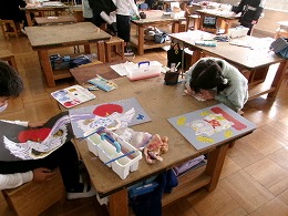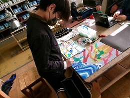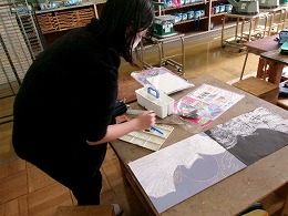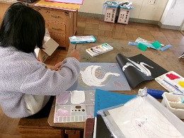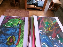 5年生が多色の版画に取り組んでいます。テーマは「和凧」、凧の絵になるようなデザインを探し、それを彫って版画にしていきました。鶴や龍など生き物を描く子が多いようでした。とても綺麗な版画に仕上がっていました。