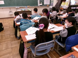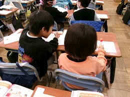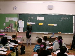1年生の算数では「ひきざん」の学習を進めています。今日は「13-9」の計算の方法を考えていました。「3から9はひけないよ」「13を10と3に分けるといいよ」など、いろいろな考えが出されていました。となりに座っている友だちと計算の方法を確かめ合いながら学習を進めていました。