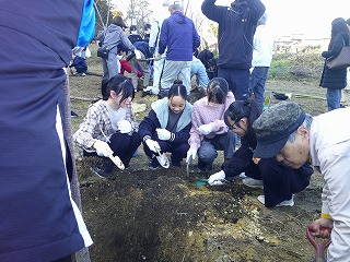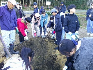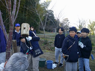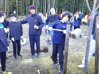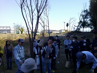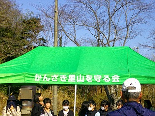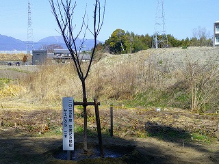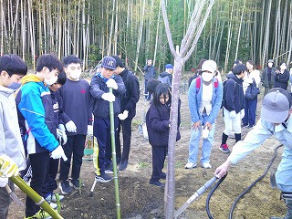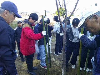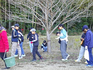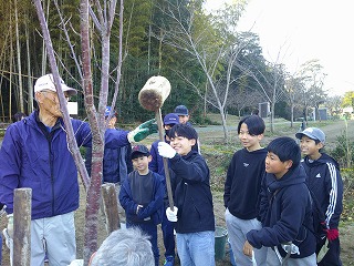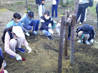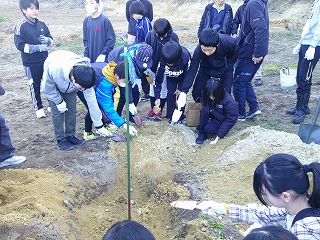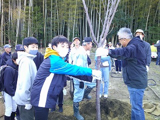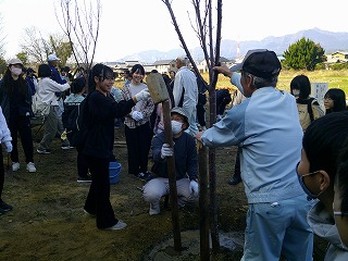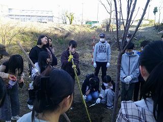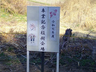 神前地区には10年以上前から続く、卒業前の恒例のイベントがあります。「神前地区地域社会づくり推進委員会」「神前里山を守る会」の方々が中心となって、神前地区にある大日山に、卒業を記念して植樹をさせていただくイベントです。今年度は、八重桜を2本植えさせていただきました。