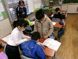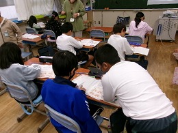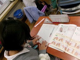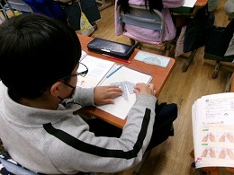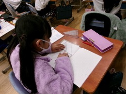 4年生が算数の時間に「三角定規を使って平行な直線をひこう」という課題に取り組んでいました。先生や友だちの説明を聞いて「わかった」と取り組みますが、実際に三角定規を操作するとなかなか思い通りにいきません。みんなで教え合って平行な直線をいくつもノートに書いていました。