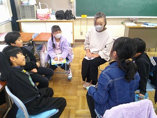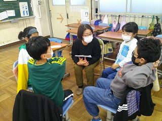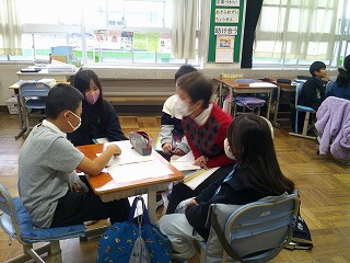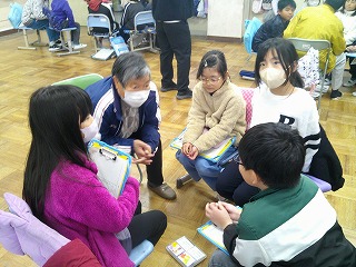 その後、神前同推協が作った「人権かるた」について、グループに分かれて話をしました。「自分が印象に残ったかるたは?」「どうしてそれにしたの?」「家でも話をしたりするの?」などと、いろいろなことを同推協のみなさんと話しました。