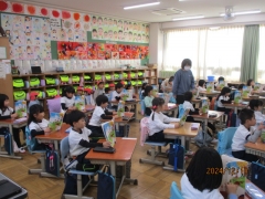 保育園の皆さんは、20分休みに到着しましたが、1年生以外の子どもたちも興味津々。知っている子に手を振ったり、中には進んで園児のお手伝いをしたりする子もいました。