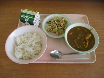 今日のメニューは、「米飯、牛乳、チキンカレー、チーズ入りツナサラダ」です。