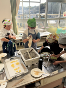 今回は、ビニール袋で作った五平餅と桃ジュースの寒天ゼリーを作りました。