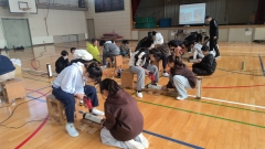 河原田ししまい保存会の方に獅子舞について話をしていただいたり、実際に触れてみる活動をさせてもらいました。