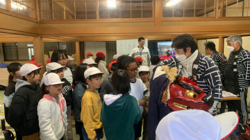 社会科で学習した獅子舞についてより詳しく説明していただき、子どもたちは興味津々でした。