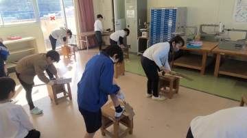 木材をしっかり押さえながら、丁寧に切っています。作品が完成するのが楽しみです。