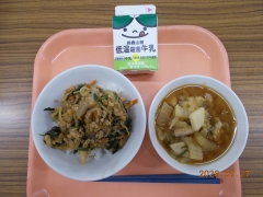 シャキシャキ鶏そぼろ丼 牛乳 僧兵汁