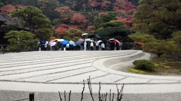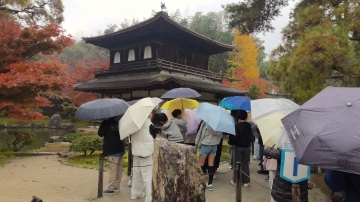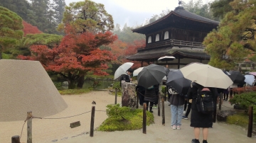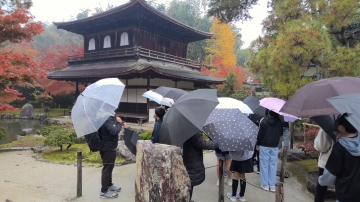 銀閣寺の見学の様子です。雨が降っているため傘をさしての見学です。人が少なくガイドさんの説明もゆっくりと聞くことができました。