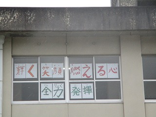 児童会が運動会のスローガンを南校舎の3階に掲示してくれました。また、昼の放送でも全校児童にアナウンスするなど、意欲的に活動しています。