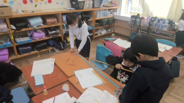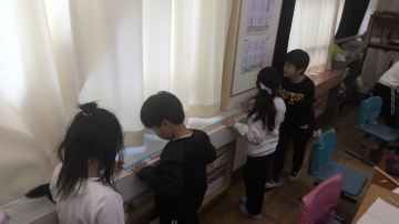 2年生の算数「長いものの長さの単位」の学習の様子です。これまでの学習では「cm」の単位で長さを表すことを学習してきました。今日は手を広げた長さを図り、それを表す単位についての学習でした。最初は30㎝のものさしを使って計っていましたが、1mのものさしを見せると子どもたちはより意欲的に長さを計っていました。