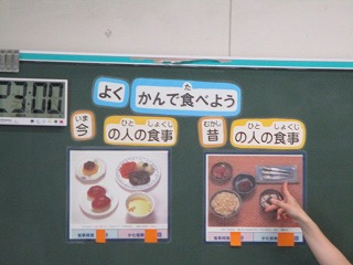 昔の食事と今の食事を比べて、よくかんで食べると体にどんな良い効果があるのかについて学んでいきました。よくかむことで脳の働きが活発になる、唾液がよく出て虫歯になりにくい等、様々な効果を確認していました。