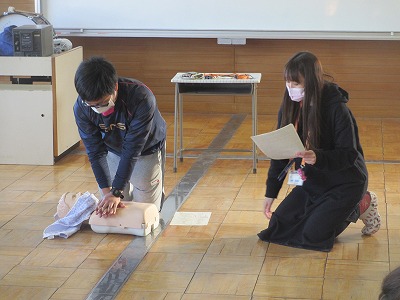 行いました。今年は、新型コロナウイルス感染症の関係で、人工呼吸の練習は行わず、心肺蘇生とAEDの使い方の確認