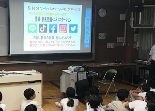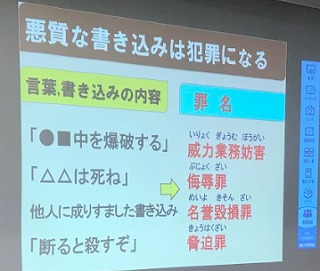 こども未来課青 少年育成室より講師をお招きし、「ネットモラル」についてお話をしていただきました。 ・SNSで起きるトラブル例 「なんで来たの?」 (どの交通手段で来たの?なぜ来たの?という意味にもとれます) 言葉が足りずに喧嘩になった事例 「○○さんの話って面白くない?」 ?の記述がなくなると、また言い方によってはいろんな意味にもとれます) 投稿者の真意が伝わらず、トラブルになった事例