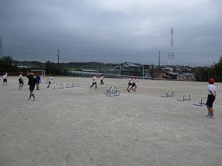 5年生が体育でハードル走に取り組んでいます。この学習のねらいは、ハードルをリズミカルに走り超える心地よさを実感するとともに、自分の記録の向上やや友だちと競う楽しさを味わうことにあります。今日は1回目ということで、子どもたちはいろんなコースを走り、自分に合ったコースを探していました。