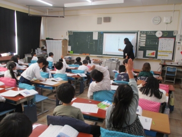 1年生が国語で「いろいろなふね」の学習をしています。船にはいろいろな種類がありますが、それぞれの特徴(つくりやはたらき)についてプリントに書き出していました。今日は消防艇についての場面でした。