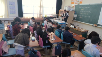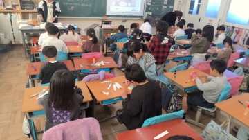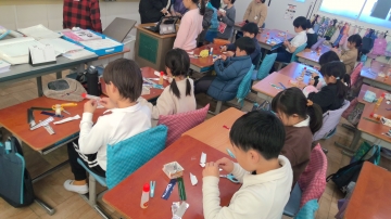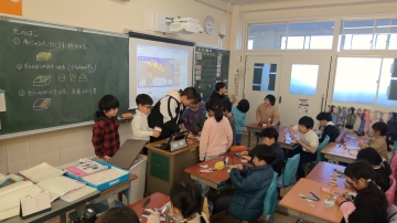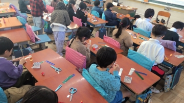 2年生の図工の様子です。牛乳パック、銀の折り紙、カラーセロハンを使って、光のはこを作っていました。牛乳パックの枠の中に銀色の紙を円くして並べいく作業が難しいいようで、何度も並べ直しながら作り上げていました。