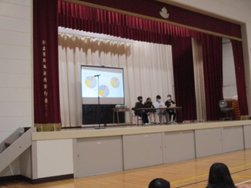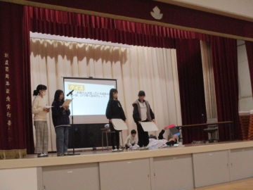 テーマは「はやね・はやおき・朝ごはん ~規則正しい生活リズムをめざそう~」です。まず、保健委員会より、生活リズムアンケートの結果の報告と劇「生活リズムモンスターに倒される」がありました。この会に向けて資料の整理や劇の練習等、保健委員はたくさん準備をしてくれていました。とてもわかりやすく内容がよく伝わる発表でした。その後、学校医と学校歯科医の先生から、日々の生活に関わってのアドバイスをいただきました。こういった機会を通して、少しでも子どもたちが健康への意識が高まってくれることを期待しています。