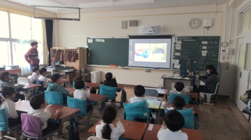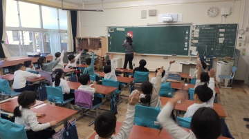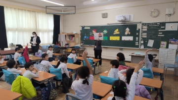 1年生の食育の様子です。食べ物の栄養を「じょうぶな体をつくるもの(赤)、病気から守ってくれるもの(緑)、強い力をつくるもの(黄)」といった3つに分類していました。「野菜は緑のなかま」「大豆は赤」等、みんなで考え合っていました。