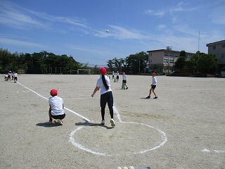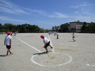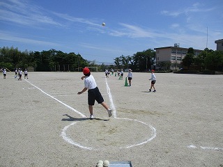 体力テストの一つ「ソフトボール投げ」に5年生が取り組んでいました。「もっと上に向かって投げるといいよ」等、周りの友だちからたくさんの声が上がっていました。