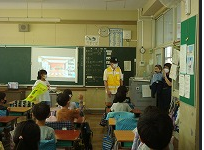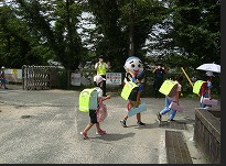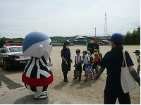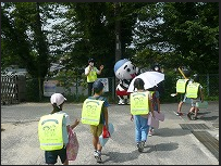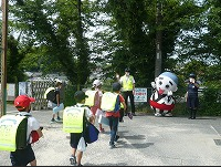 さらに四日市南地区交通安全協会服部会長から代表の児童の方への「まもってくれてありがとう横断旗」の授与があり、各クラスを腹話術のケンちゃんとともに回って頂きました。最後は四日市南警察署と合同による「下校指導」があり、こにゅうどうくんも一緒に歩いてくれました。
