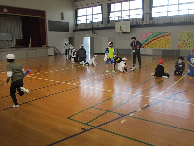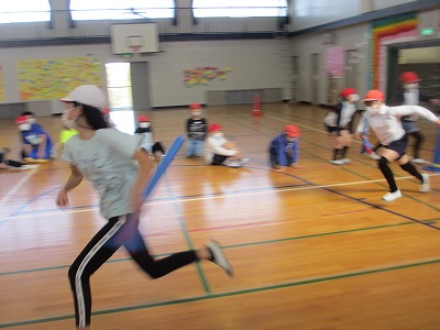 5年生がお楽しみ会で、エンドレスリレーをやっていました。2チームで、体育館の対角線上からスタートしてリレーをしていき、前を走る