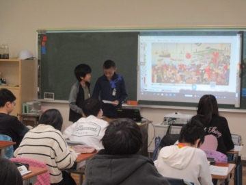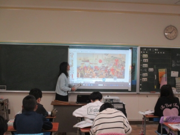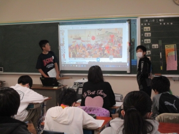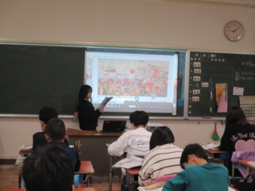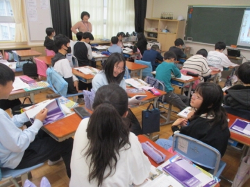 6年生の社会の学習の様子です。1853年に浦賀にペリーが来航したとされています。その際に要求された事柄や状況を、教科書や資料集、インターネット等で調べ、そのことについて各自がまとめ発表する時間でした。まとめたノートを読む子やニュース風に伝える子など、伝え方にはいろいろな工夫がありました。