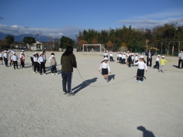 1年生が大縄跳びに取り組んでいました。最初はいろいろな跳び方を楽しんでいましたが、最後は回したなわを跳んでいました。なわの回し役の子も、体いっぱい使って一生懸命に回していました。「やった、跳べた。」など、うまくいった時には思わず声が上がっていました。