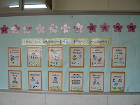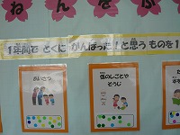 保健室の前には、今年一年を振り返って、頑張ったことをシールで貼る掲示があります。みんなそれぞれ1枚だけシールを取り、自分が一番頑張った所に貼っていきます。多かったのは、勉強・友達と仲良くする・習い事でした。“仲良くする”が枠に入りきらないほど多かったのは、とてもうれしい結果でした。