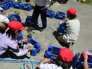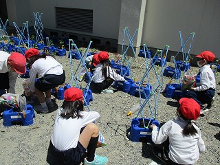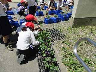 2年生が野菜を植えていました。ピーマン、ミニトマト、おくら、なすと4棲類の野菜からお気に入りの野菜を一つ選んで植えていました。野菜の苗を自分の鉢に移しかえるとき、ビニールの鉢からなかなか苗を取ることができない子がいると、周りにいた子が「こうやって取るといいよ」と教え合う姿がありました。「ミニトマトが好きだからこれにしたん」「早く大きくならないかな」等、子どもたちの様子を見ているといろいろな声も聞こえてきました。