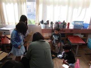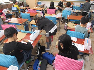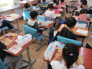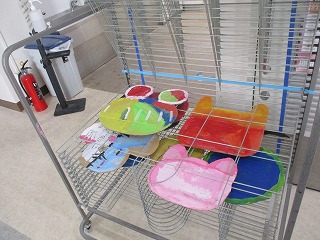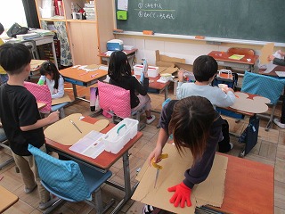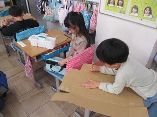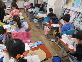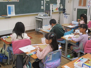 1年生が図工で「おめん」づくりをしています。これまでの時間に考えたデザインをもとに段ボールを切り、絵の具で色を塗っていました。「さあ、ぬるぞ」という声が聞こえてきました。服の袖をまくり上げる子もいました。みんな意欲的に色塗りに取り組んでいました。