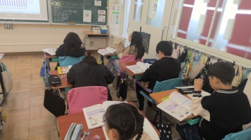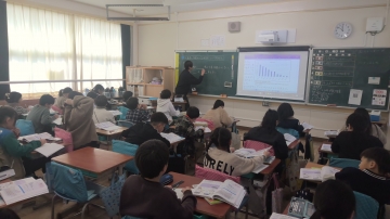 4年生の社会では「三重県と外国のつながり」について学習していました。三重県の各市における外国人の人数が教科書に載っています。グラフからそれらの数を読み取り、ノートにまとめたり意見交換していました。