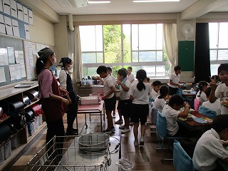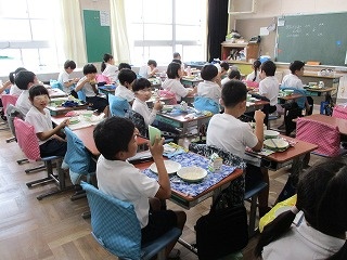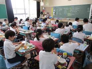 今日の給食は「小型玄米パン、牛乳、イタリアンスパゲティ、フルーツヨーグルト」でした。スパゲティ、ヨーグルトとも人気のメニューです。3年生の教室をのぞくと、スパゲティにはおかわりの長い列ができていました。