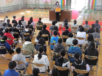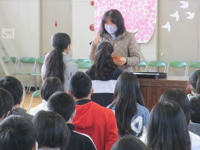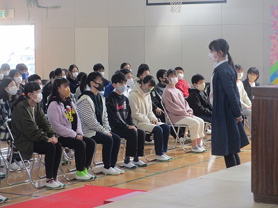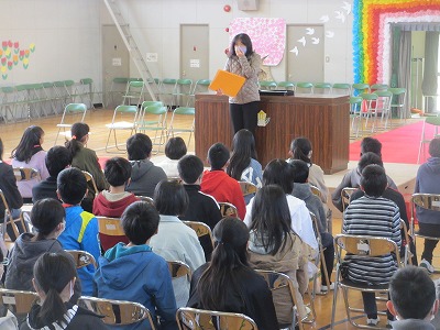 昨年度の担任で本年度は理科担当だった 中村先生を舞台中央に招いた子どもたちが感謝の呼びかけをし、感謝の手紙を渡していました。