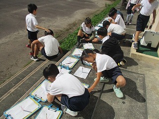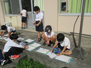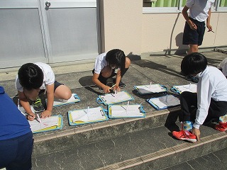 3年生が理科で「太陽とかげの動き」を観察していました。午後になっても太陽の当たる場所を見つけ、1時間ごとに太陽やかげの動き等を印していました。