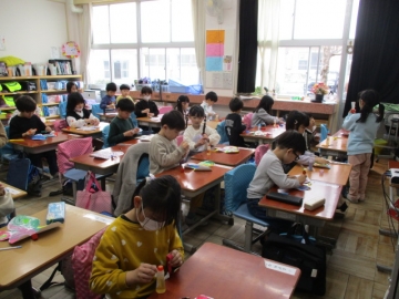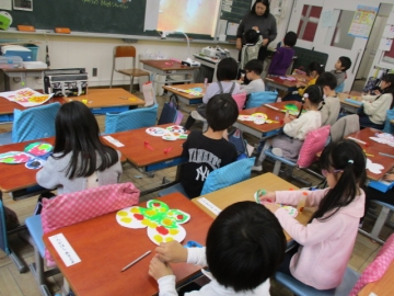 1年生が4月に入学してくる新1年生のために飾りづくりに取り組んでいました。蝶の型紙に思い思いの模様を書き、色を塗っていきました。「できた」「上手にできたやろ」等、嬉しそうな声があちこちから聞こえてきました。とても素敵な飾りが完成していきました。