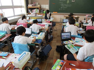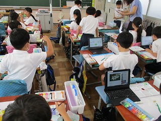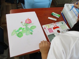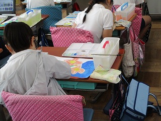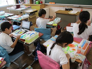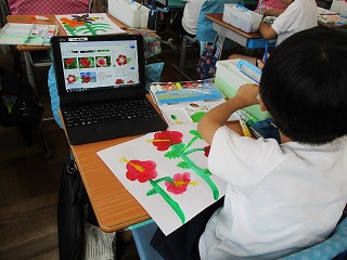 3年生が図工で「すてきな色ですてきな花を」描くことに取り組んでいました。色を重ねてぬるところがこの時間の一番難しいところです。乾いたところからぬらないと色が混ざってしまします。工夫してすてきな色をつくりすてきな花を描いていました。
