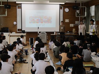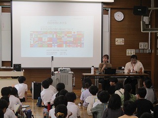 4年生が昨日、社会科の「住みよいまちづくり」の学習として、多文化共生の出前授業を受けました。四日市市の多文化共生の取り組み等を2名の講師の方にお話しいただきました。