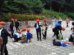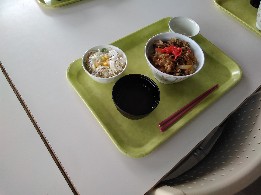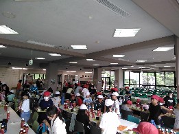 ウォークラリーから帰ってきた後は、昼食です。メニューは牛丼です。みんな楽しそうに食べています。
