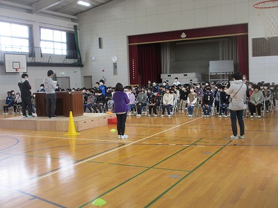 上手に呼びかけをしていました。体育館の飾りつけも日に日に立派になっています。