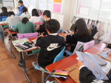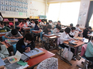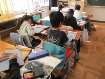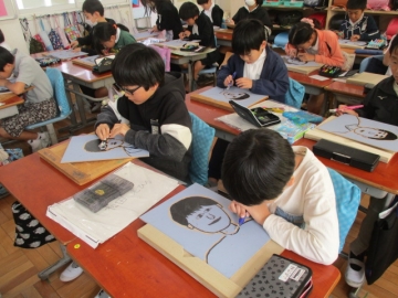 4年生が彫刻刀を使って、版画の板に自分の顔を彫っています。まだまだ彫刻刀を使い慣れていない子どもたちですが、ケガをしないように気を付けながら黙々と彫っていました。出来上がりが楽しみです。