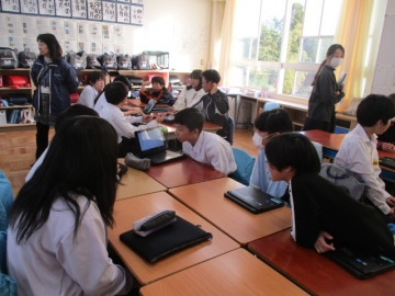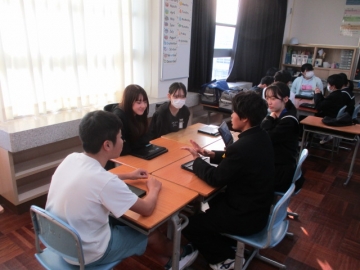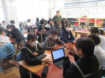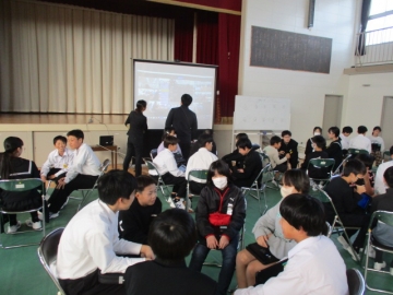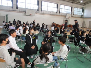 昨年までは、神前小学校に各小中学校から代表者が集まって開催し、その話し合われたことを各学校へ持ち帰り、さらに学習を深める形でした。今年は全員が参加しての開催とし、3つの小学校にそれぞれの卒業生(1年生)が出向くという形で開催しました。
