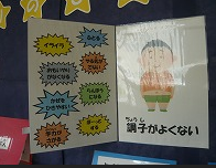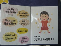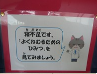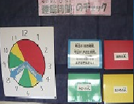 現在、保健室の前には、「ねむりのひみつ」が掲示されています。時計の針を寝た時刻と起きた時刻に合わせると、その色によって、寝不足か、それともぐっすり寝ることができたかが分かります。すいみんをしっかり取るためのアドバイスも書いてあります。