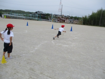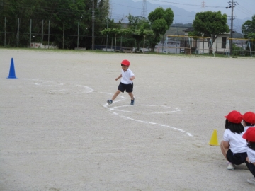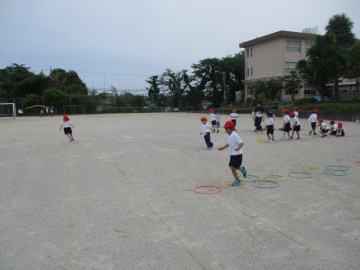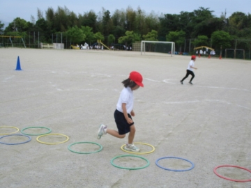 1年生が体育でいろいろなコースを走って楽しんでいました。ぐるぐる回ったりケンケンパをしたりと、いくつかのコースを楽しそうに走っていました。何度も走るうちに早く走るコツをつかみ、だんだんとスピードも上がっていきました。