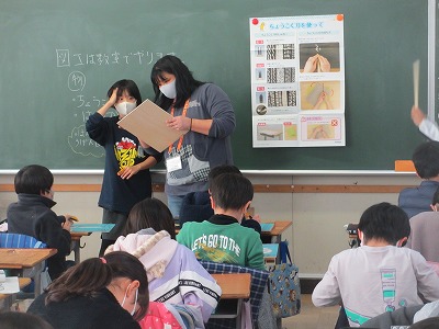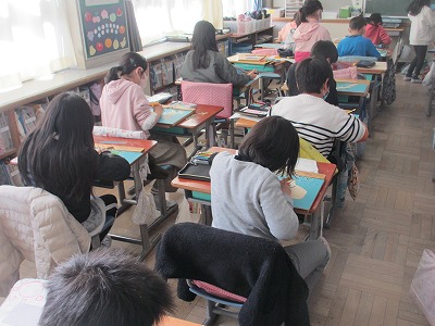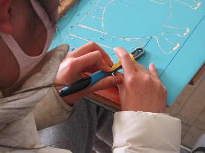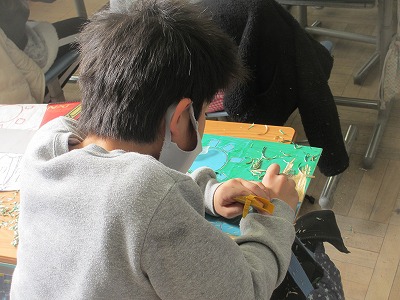 4年生が版画に取り組んでいました。手を切らないように、慎重に、動物の絵を掘っていました。