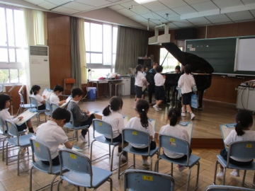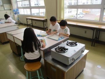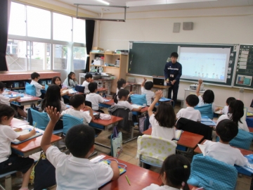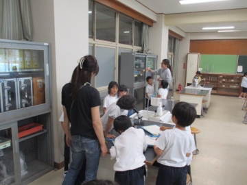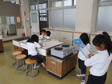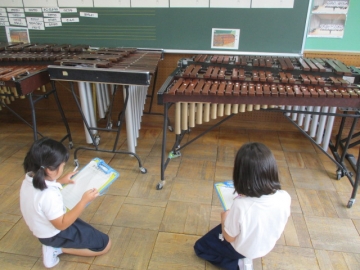 1年生が「学校探検」をしていました。今日は南校舎の特別教室の見学でした。理科室、家庭科室、音楽室とクラスごとに見学していました。理科室では実験器具を見て「使ってみたい」と声があがっていました。音楽室では専科の小林先生がピアノの演奏をしてくれました。木琴をはじめいろいろな楽器に興味津々でした。