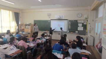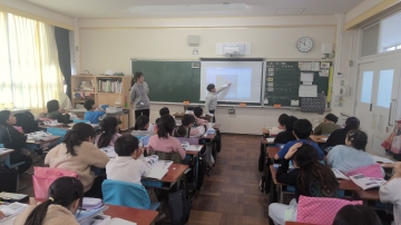 3年生の社会では「四日市市のうつりかわり」について学習していました。のびゆく四日市に載っている写真や地図をもとに、気づいたことや知っていることを発表し合っていました。