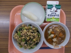 鶏そぼろ丼 牛乳 地物たっぷりみそ汁 梨