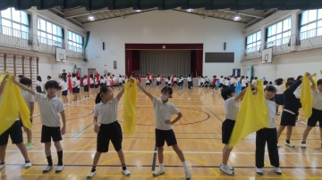 4年生は表現運動の練習でした。各クラスごとに赤青黄のバンダナを持ちながら動きの確認をしていました。